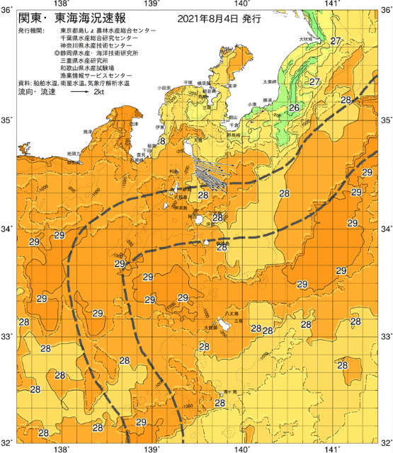 今日の海況速報を見ると・・・東経140°付近に流れていた黒潮が南下して、野島崎の沿岸沿いから離れましたが、オレンジ色の水温帯が南から北上し、黄緑の水温帯が東へと移動しています。 この影響で、今日の水温が上がったかと思います。