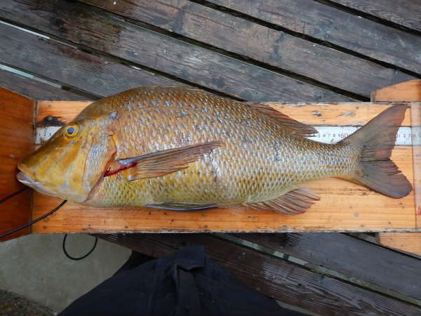 フエフキ 73.4㎝ 5.5㌔ エサはヤドカリ 10:40頃にヒットしたそうですが、なかなか寄せる事が出来ず、思わずビッグサイズのイシダイがヒットしたと思いながら、40分位格闘して水面に上げると・・・😱