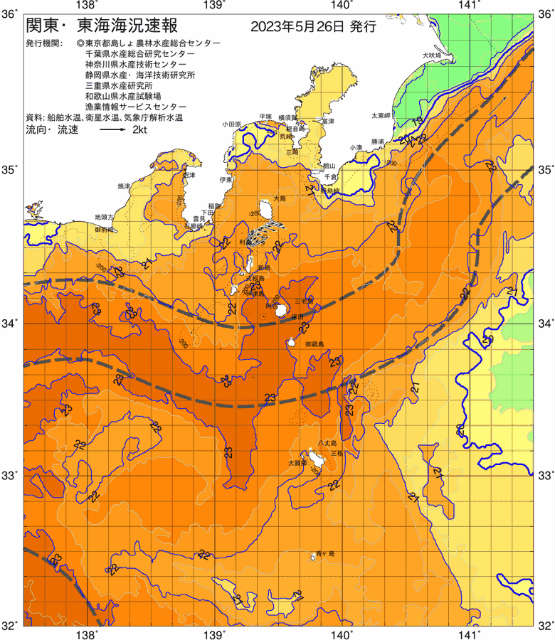 今日の海況速報を見ると・・・今日の潮が水温も上がり、水色も澄んでいたのは、薄黄緑の水温帯から薄黄の水温帯に覆われた影響かも知れませんね。