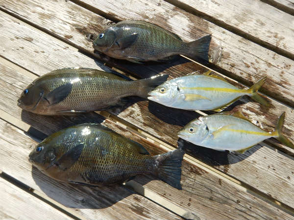 メジナ 30㎝ 2枚 シマアジ 25㎝ 2枚 30㎝クラスのシマアジが水面で口切れでバレてしまったそうです。